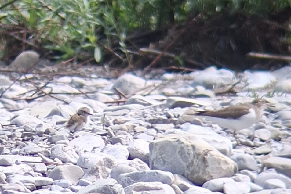 Der Brutbestand des Flussuferläufers im Tauglgries wird im Rahmen eines Monitorings jährlich untersucht. Dabei werden anhand von Beobachtungen der Altvögel die Brutreviere lokalisiert und gezählt. Da die Vögel in Ihrem Brutverhalten durch das Monitoring nicht gestört werden dürfen, gelingt es allerdings nur selten nachzuweisen, ob die Brut der Tiere auch tatsächlich erfolgreich war. 2025 konnten jedoch wieder Jungvögel des Flussuferläufers im Tauglgries beobachtet werden. Nur für wenige Augenblicke waren drei Jungvögel auf der Kiesbank zu sehen, bevor sie von den Altvögeln in die sichere Deckung geführt wurden. Als Nestflüchter sind die Jungvögel bereits kurz nach dem Schlupf auf den Beinen und machen ihrem Namen alle Ehre. Allerdings sind sie nur schwer zu entdecken, da sie bei drohender Gefahr von den Altvögeln gewarnt werden und sich in der Vegetation verstecken. Auffällig sind die Tiere vor allem aufgrund ihrer schrillen Lautäußerungen. Wenn die Altvögel in ihrem schwirrenden Flugbild knapp über der Wasseroberfläche fliegen, ist häufig ein lautes „hii-dii-dii-dii-dii“ zu hören. Bei Gefahr geben die Vögel ein gedehntes und durchdringendes „hiiip!“ von sich. Dieser auffällige Warnruf ist für Besuchende ein Hinweis darauf, dass man in das Revier eines Flussuferläufers eingedrungen ist und als Störung wahrgenommen wird.